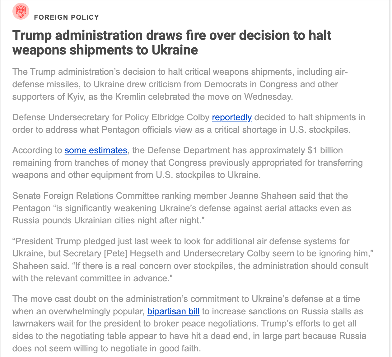 • The United States halted shipments of some air defense missiles and other precision munitions to Ukraine over concerns that U.S. weapons stockpiles have fallen too low, the Wall Street Journal reports.