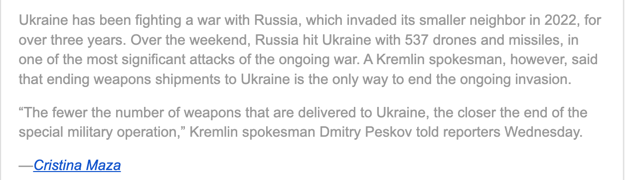 • Russia hit Ukraine with 537 drones and missiles in Moscow’s most significant attack of the war, Politico Europe reports. Neighboring Poland scrambled jets and activated its ground-based air defense units into readiness mode because of the attacks across the border in Ukraine.
